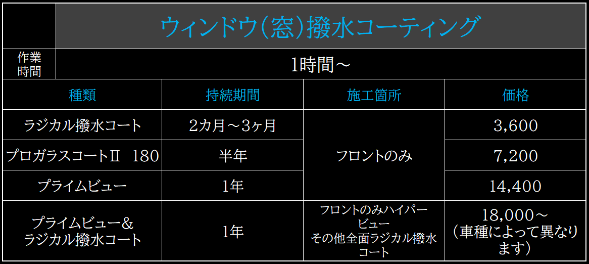 〜 ウィンドウ撥水コート 価格表(税込) 〜