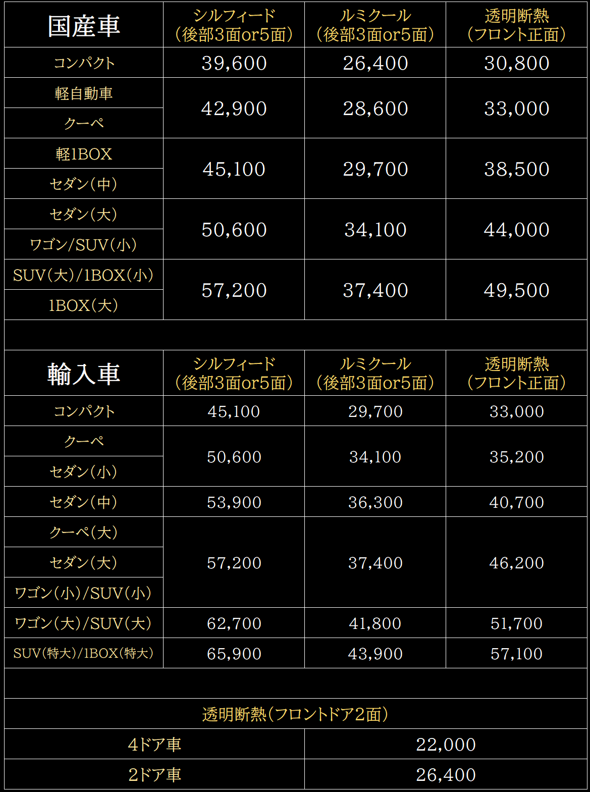 当店では、カーフィルムにおける国家資格(ガラス用フィルム施工技能士)を所有したプロのスタッフが施工しております。施工時の仕上がりは勿論のこと、その他UV、断熱、その他透過率や紫外線カット率等、様々なカーフィルムをご用意しています。お客様のご要望をプロのスタッフがリスニング、ご提案さていただきます。