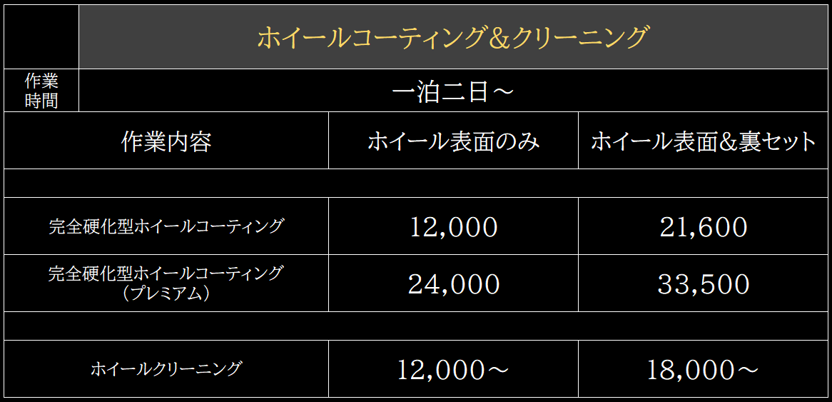 〜 ホイールクリーン&コート価格表(税込) 〜