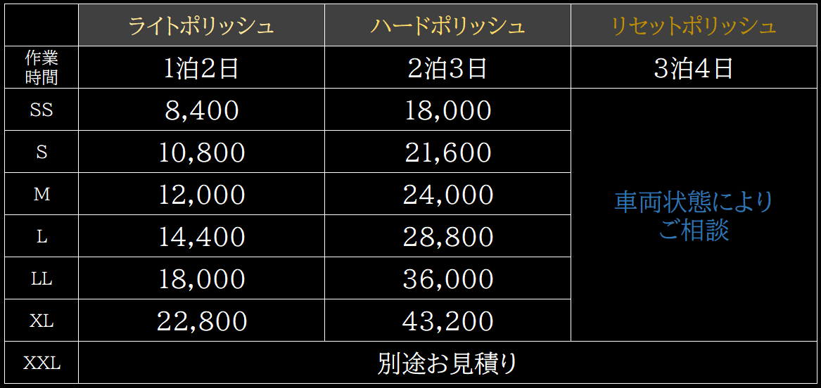 〜 ポリッシュ(下地研磨) 価格表(税込) 〜
